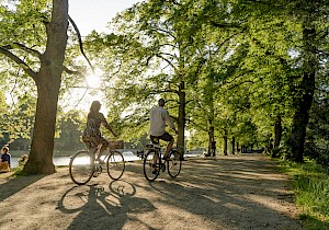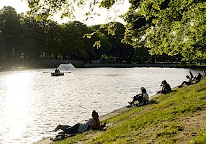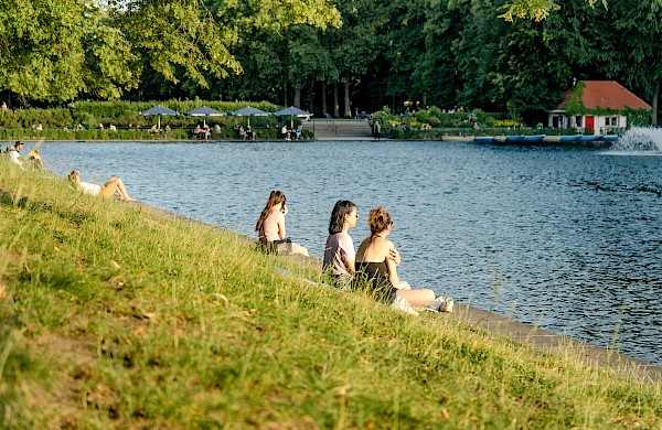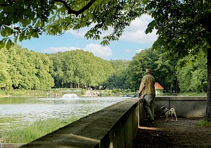 Die langen Seiten des Weihers werden von Lindenalleen gesäumt, deren Bäume zum Teil mehr als 100 Jahre alt sind. Die Alleen münden in breite Treppen, die zu zwei erhöht liegenden, baumbestandenen Plätzen führen. Die Seiten dieser Aufgänge sind mit je zwei großen, liegenden Steinlöwen geschmückt, die zu den wenigen Skulpturen gehören, die eigens für eine Kölner Parkanlage geschaffen wurden.