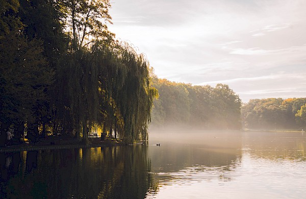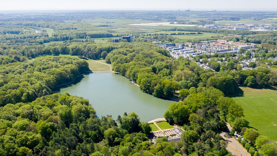 Blick über den Adenauer Weiher aus Richtung des Rhein-Energie-Stadions. Im Vordergrund der Club Astoria, rechts die Jahnwiesen. © Raimond Spekking / CC BY-SA 4.0 (via Wikimedia Commons)
